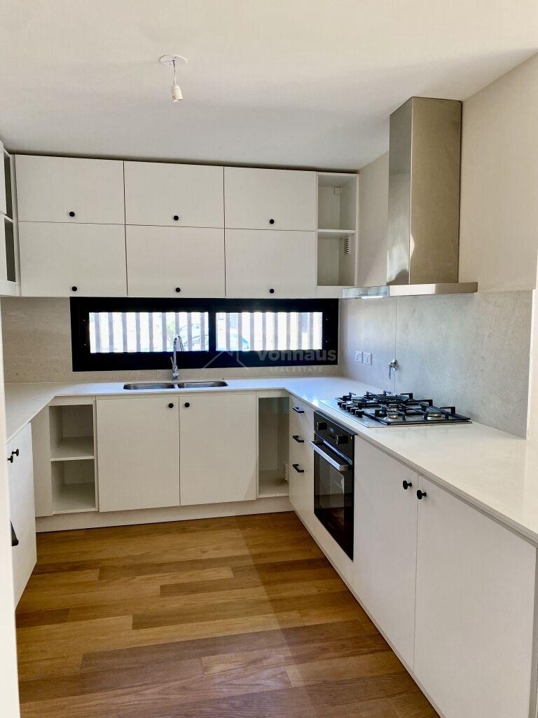 Cocina semi-integrada con barra que se comunica con el living (equipada con anafe a gas, horno eléctrico y campana de extracción