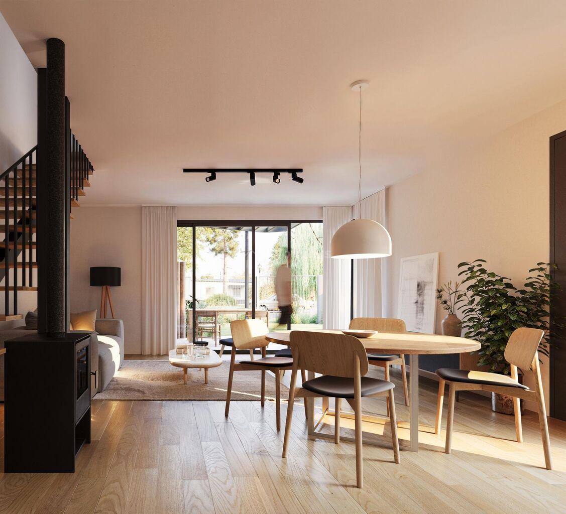 Living comedor con estufa de alto rendimiento. Amplios ventanales con salida al jardin y parrillero.