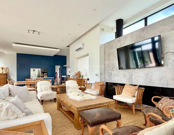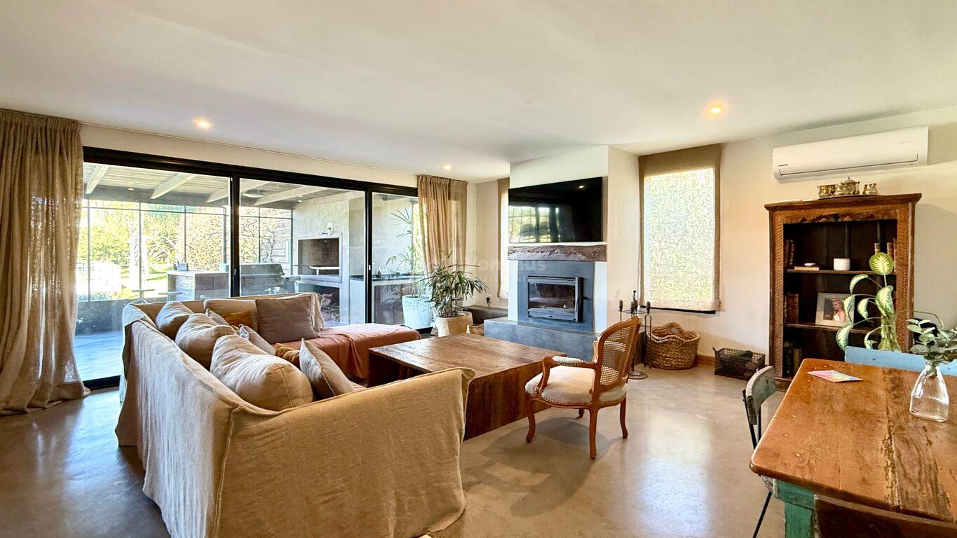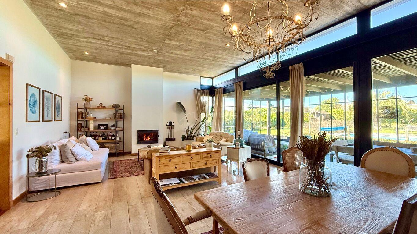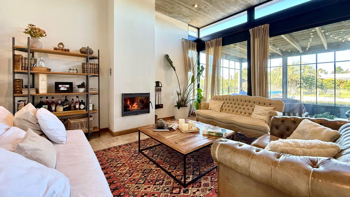 Estar con estufa a leña, que conecta al comedor a través de puertas corredizas.
