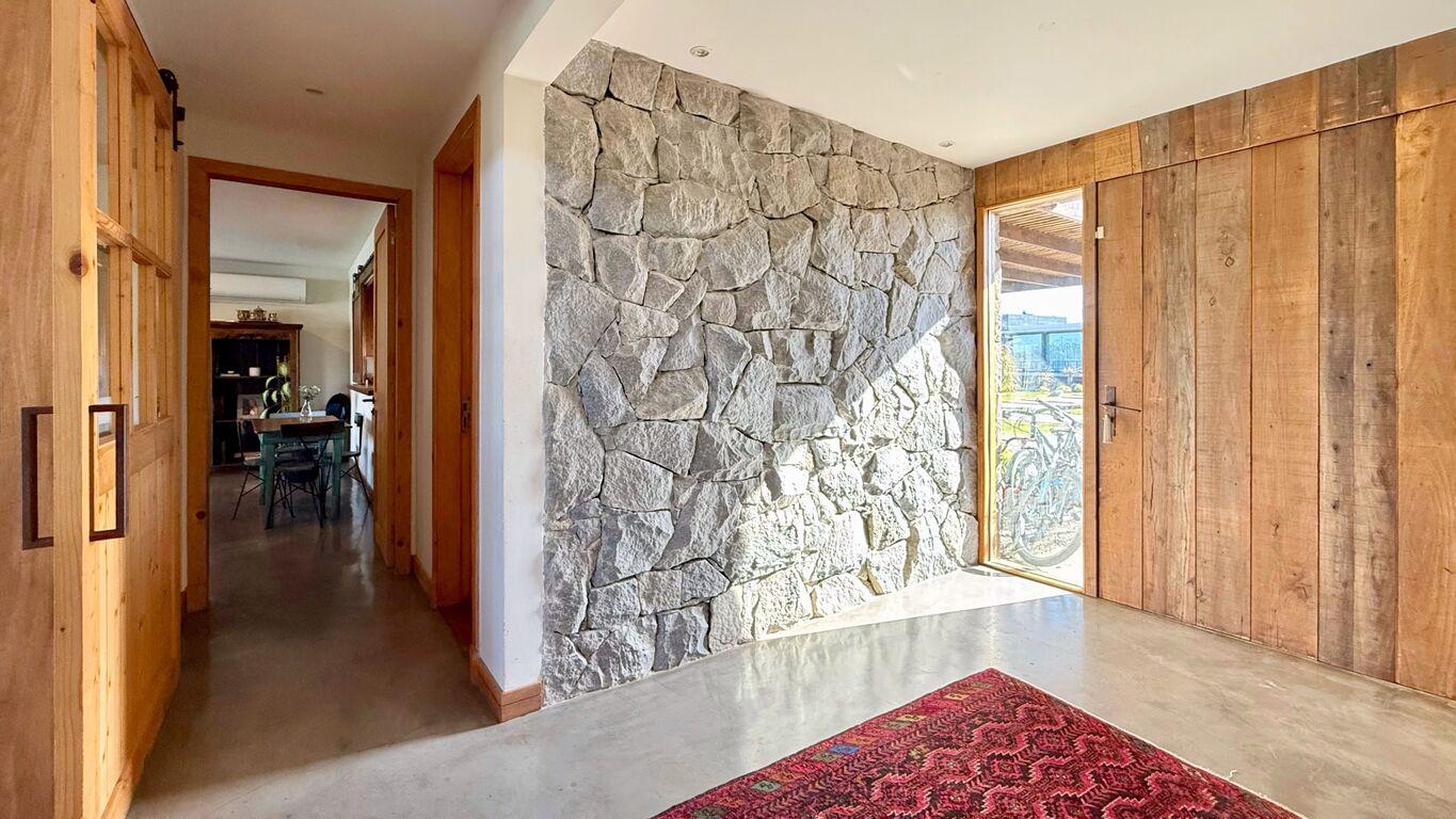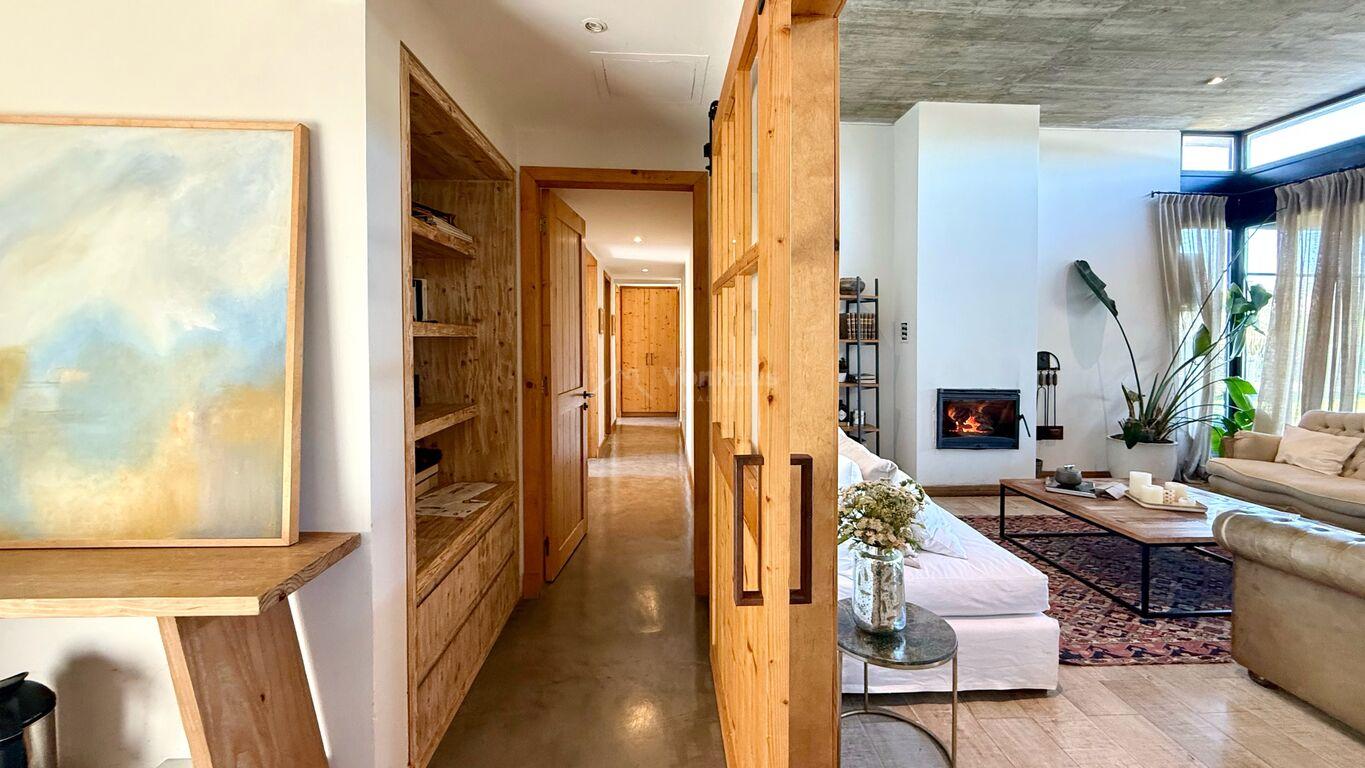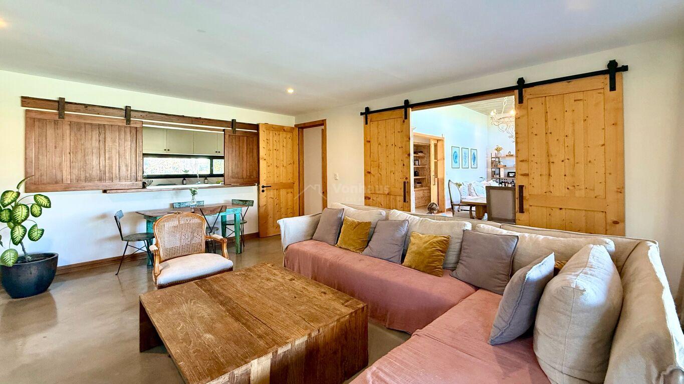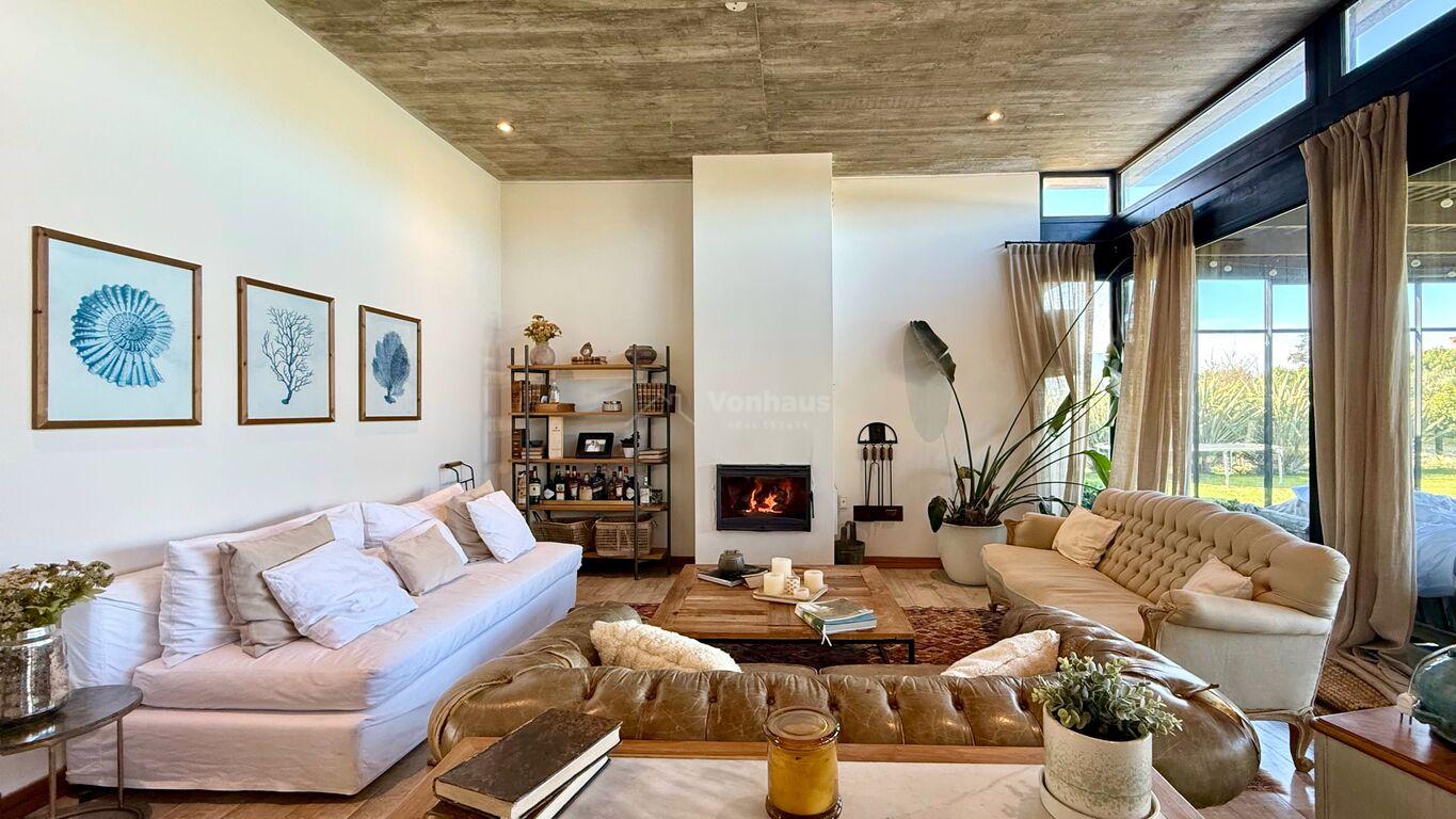 Estar con estufa a leña, que conecta al comedor a través de puertas corredizas.