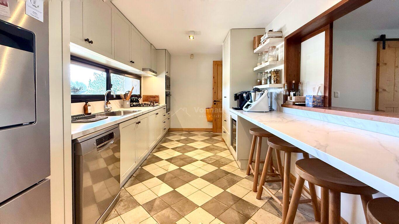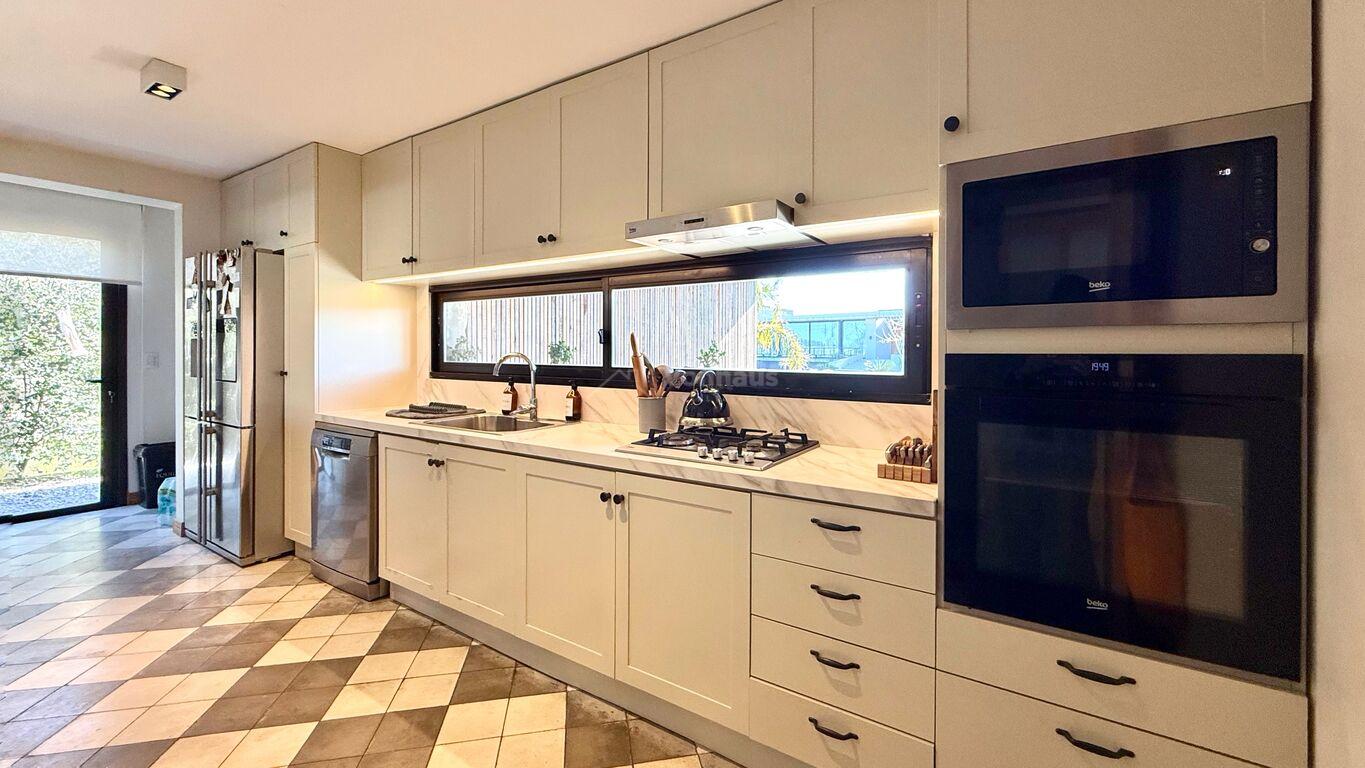 Cocina con pasaplatos junto al estar, con ventana corrediza para dar privacidad. Equipada electrodomesticos empotrados.