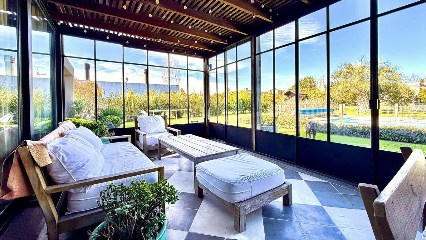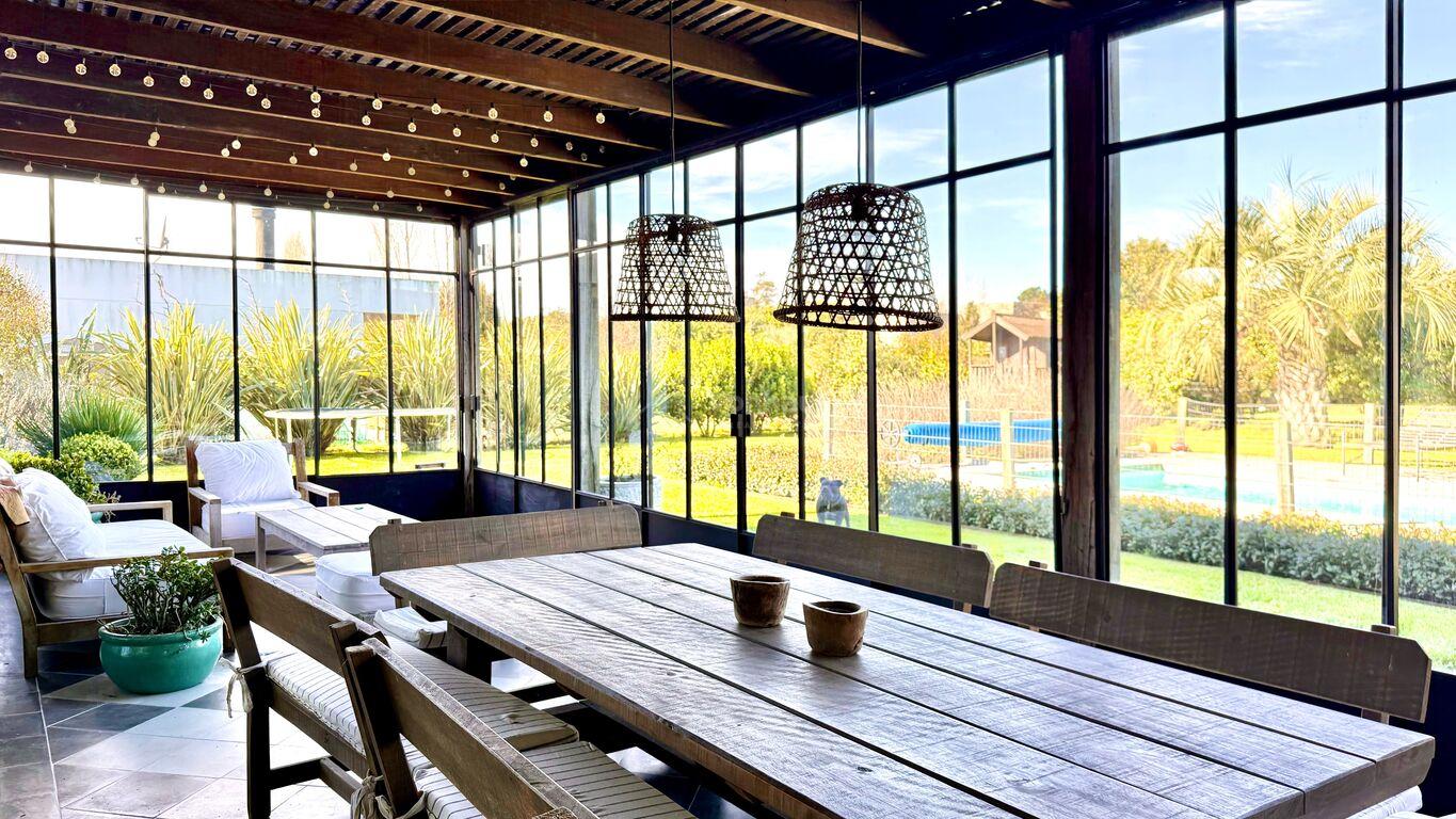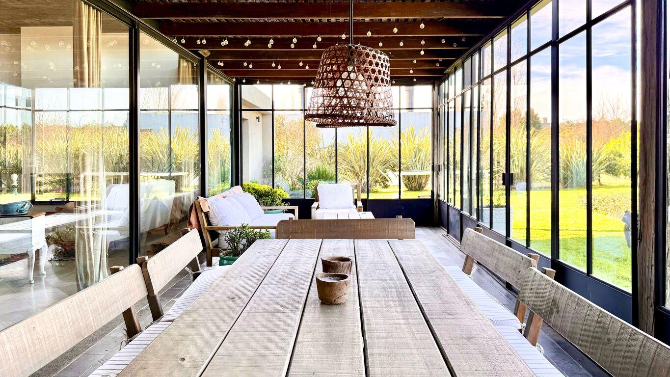Amplia galería/barbacoa con parrillero cerrada, con puertas corredizas, que ofrece vistas panorámicas al jardín y la piscina.
