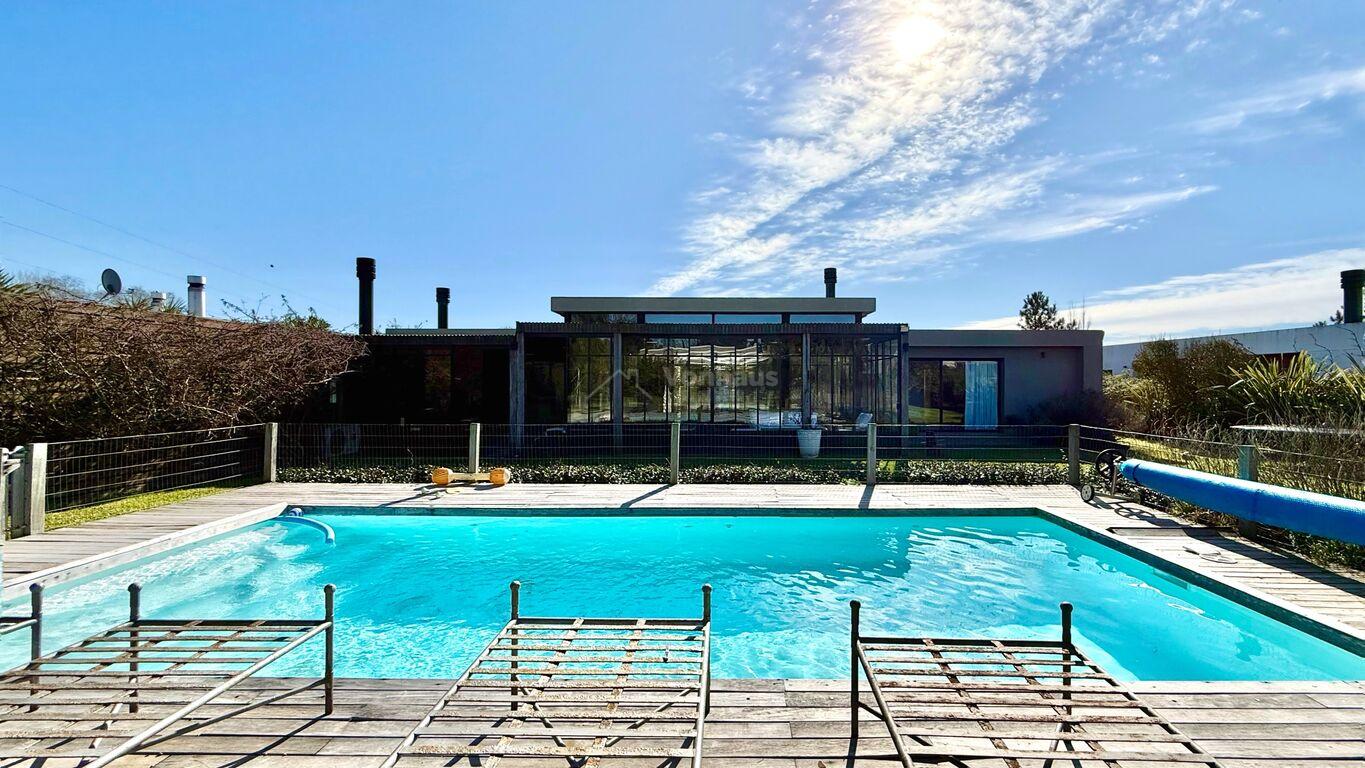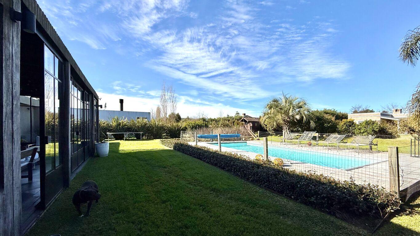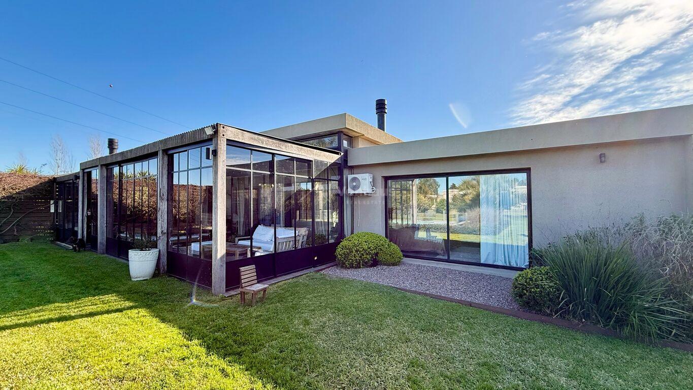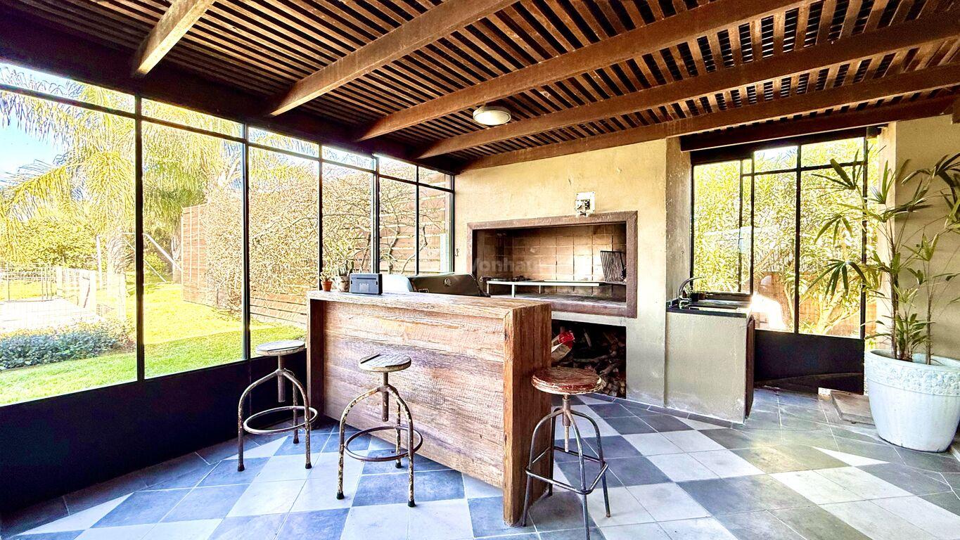 Amplia galería/barbacoa con parrillero cerrada, con puertas corredizas, que ofrece vistas panorámicas al jardín y la piscina.