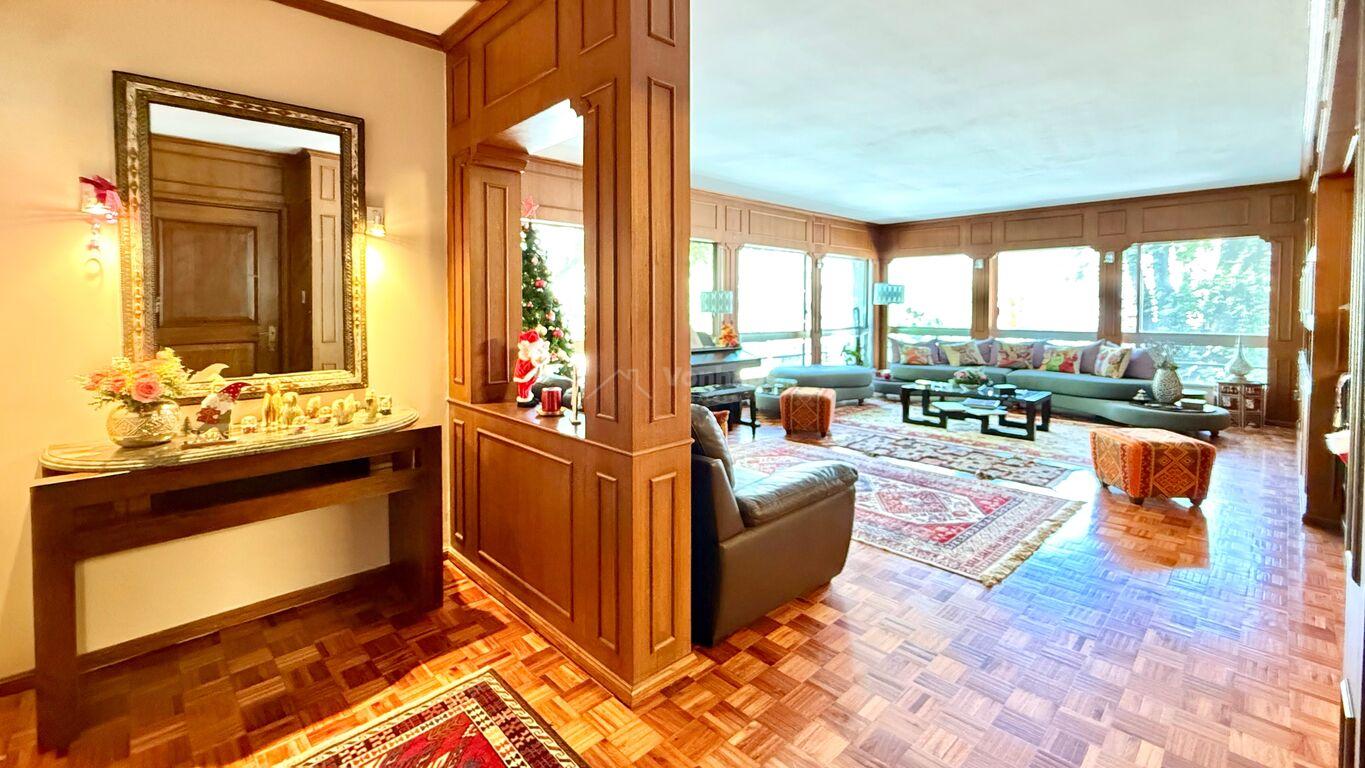 Hall de entrada que conecta a un amplio living comedor, con piso de parquet y paredes revestidas en madera.
