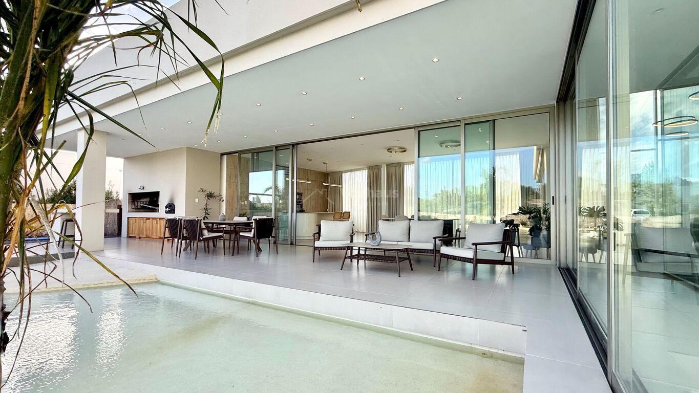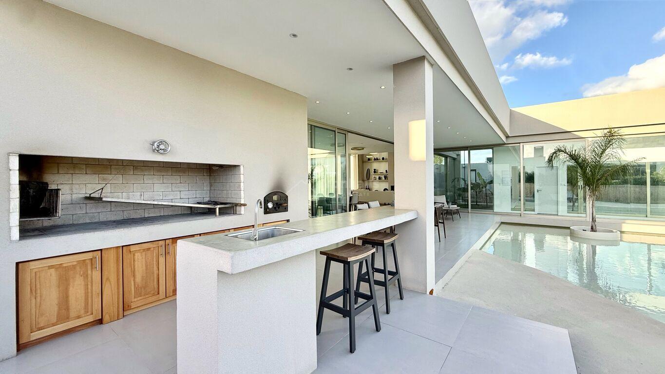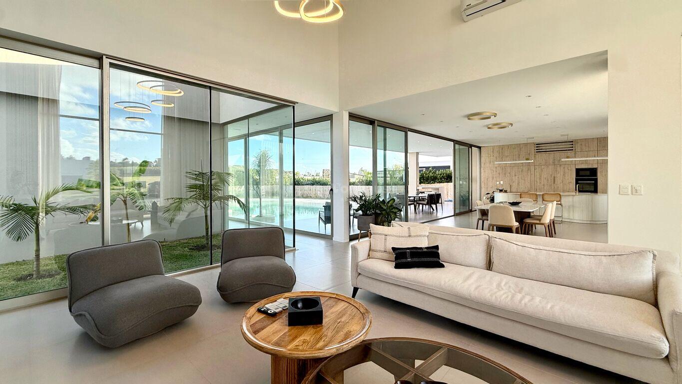 El área íntima tiene tres dormitorios en suite y el dormitorio principal con vestidor., pérgola techada con parrillero y jardín con piscina climatizada y diseño de paisajismo realizado.